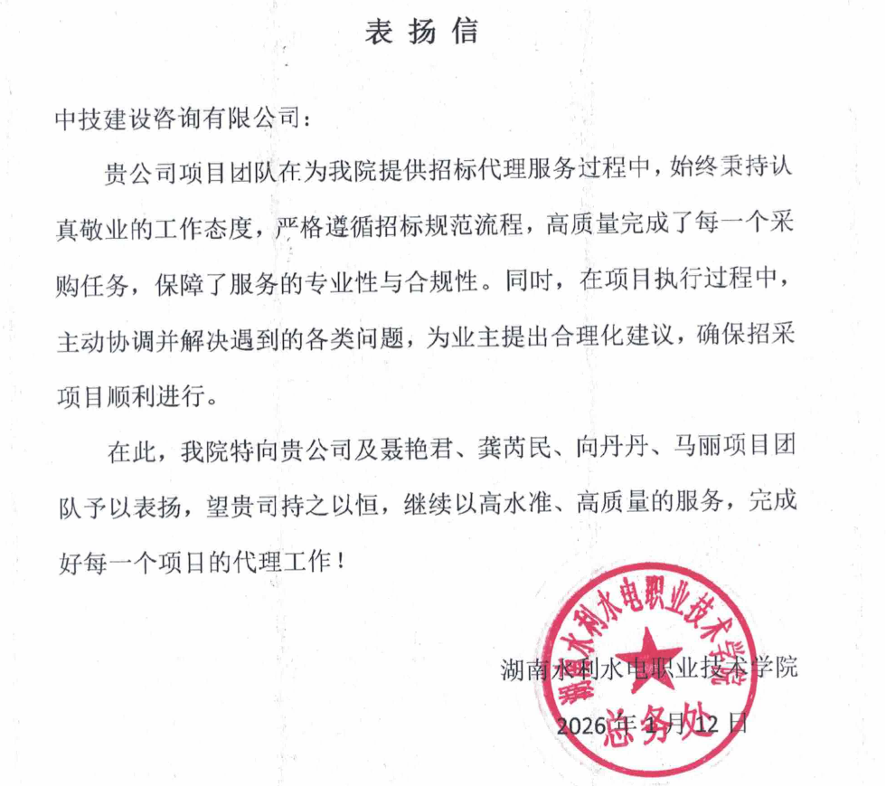 1月12日,我司收到来自湖南水利水电职业技术学院的一封表扬信,信中对我司聂艳君、龚芮民、向丹丹、马丽所在的招标代理团队,在项目服务过程中的专业表现给予了高度赞扬。