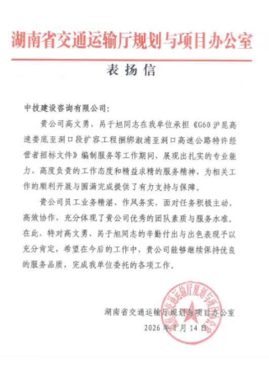 1月14日,我司收到湖南省交通运输厅规划与项目办公室发来的表扬信,对由呙于旭、高文勇带领的招标代理团队在项目服务全程展现出的专业素养与责任担当给予高度肯定和赞扬。在本次招标代理服务中,我司项目团队始终秉持高度负责的职业精神,严格遵守相关法律法规与招标流程规范,以严谨细致、精益求精的态度扎实推进各项工作。面对项目执行中的各类复杂情况,团队主动作为,积极搭建沟通桥梁,高效协调内外资源,妥善解决工作难点;同时结合项目实际,精准提出多项合理化建议,有效优化了项目推进路径,为招标工作的高效、有序、合规开展提供了坚实保障。信中特别指出,我司员工业务功底扎实、工作作风务实,在任务繁重的情况下主动靠前、密切协同,充分展现出卓越的团队凝聚力与高水平的服务能力。