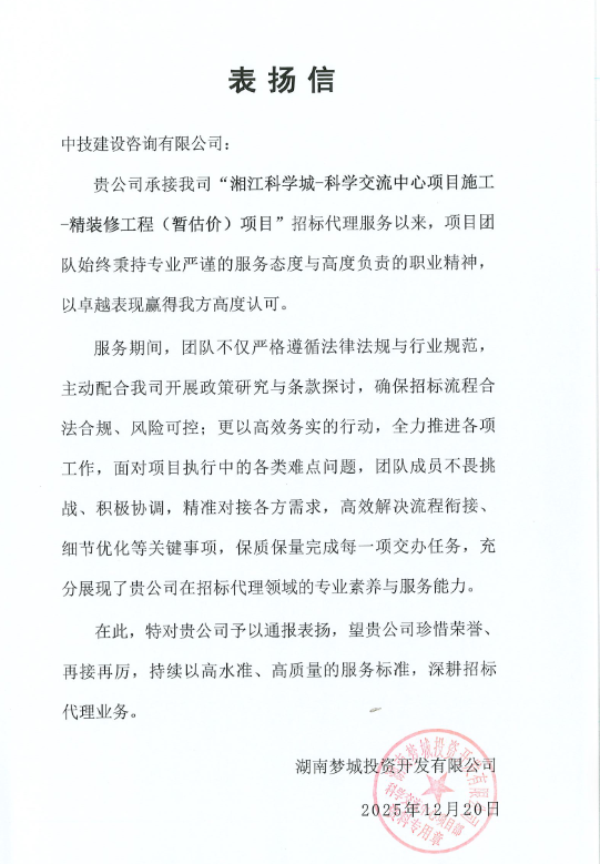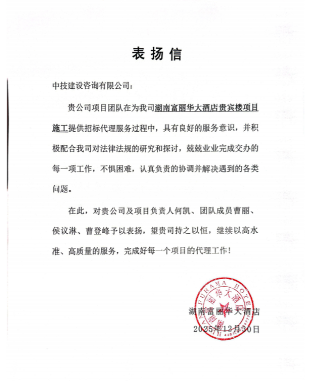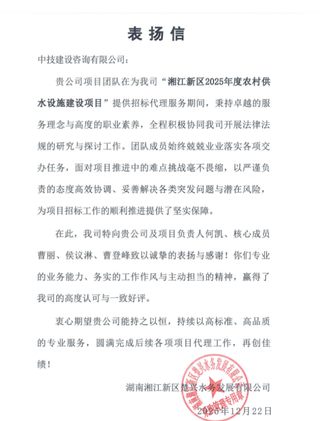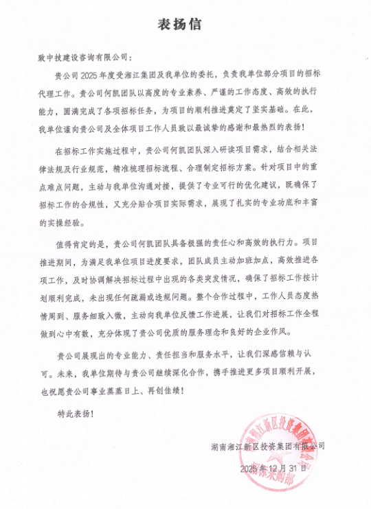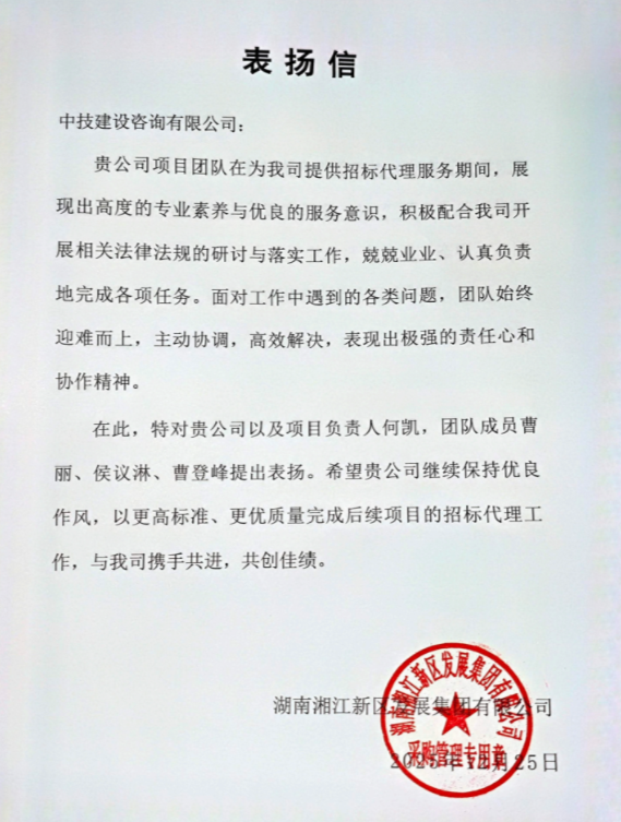近日,我司招标代理业务何凯团队凭借卓越的专业素养与高效的服务能力,相继获得湖南湘江新区发展集团有限公司、湖南湘江新区投资集团有限公司、湖南湘江新区楚兴水务发展有限公司、湖南梦城投资开发有限公司及湖南富丽华大酒店的一致赞誉。