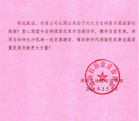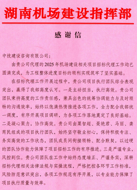 2月5日,我司正式收到湖南机场建设指挥部发来的感谢信,信中对我司在招标代理工作中作出的贡献予以高度肯定,并对项目团队的辛勤付出表示诚挚感谢。