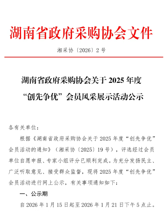 1月15日,湖南省政府采购协会正式公示了2025年度“创先争优”会员风采展示活动评选结果。我司汤敏同志凭借其在政府采购领域的卓越表现、专业素养和突出贡献,经过严格的会员单位申报、专家小组评审等环节,成功获评此项荣誉。